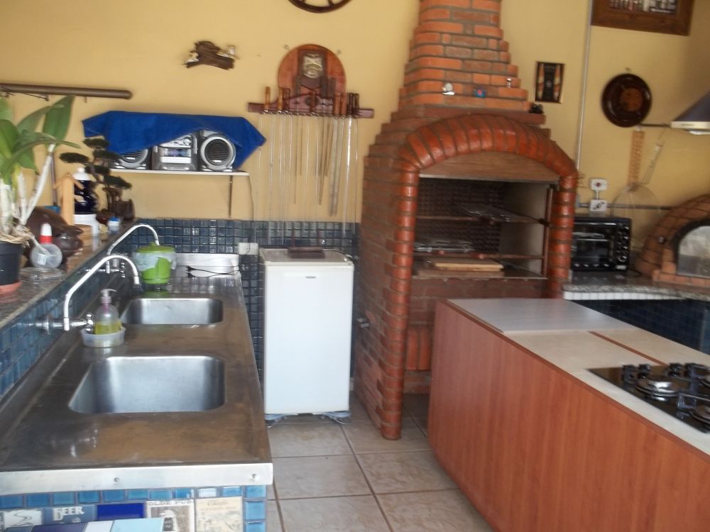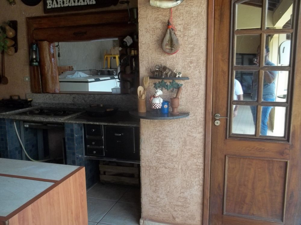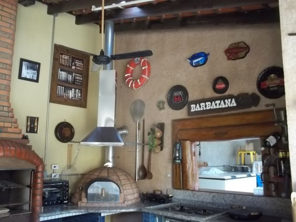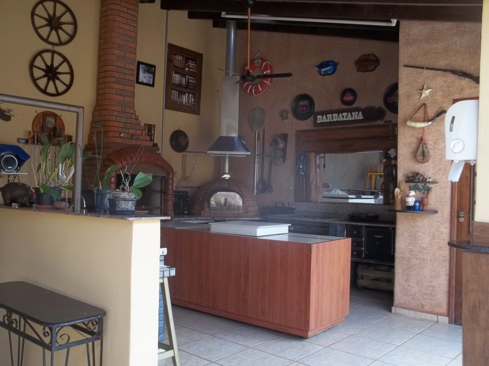 - Espaço gourmet, contendo fogão à lenha, fogão industrial, churrasqueira, forno a lenha, balcão masterchef com cooktop